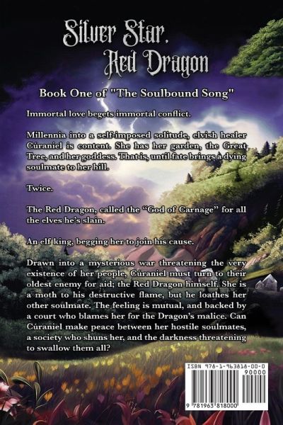 Immortal love begets immortal conflict. Millennia into a self-imposed solitude, elvish healer Cúraniel is content. She has her garden, the Great Tree, and her goddess. That is, until fate brings a dying soulmate to her hill. Twice. The Red Dragon, called the "God of Carnage" for all the elves he's slain. An elf king, begging her to join his cause. Drawn into a mysterious war threatening the very existence of her people, Cúraniel must turn to their oldest enemy for aid; the Red Dragon himself. She is a moth to his destructive flame, but he loathes her other soulmate. The feeling is mutual, and backed by a court who blames her for the Dragon's malice. Can Cúraniel make peace between her hostile soulmates, a society who shuns her, and the darkness threatening to swallow them all? "Silver Star, Red Dragon" is an epic dark romantic fantasy for those who wished "Lord of the Rings" had a bit more "Kushiel's Dart."