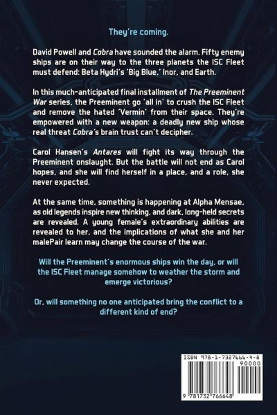 In this much-anticipated final installment of The Preeminent War series, the Preeminent go 'all in' to crush the ISC Fleet and remove the hated 'Vermin' from their space. They're empowered with a new weapon: a deadly new ship whose real threat Cobra's brain trust can't decipher. Carol Hansen's Antares will pay a heavy price as it fights through the Preeminent onslaught. But, the battle will not end as Carol might hope, and she will find herself in a role, and then a place, place, she never expected. At the same time, something is happening on the Preeminent home planet at Alpha Mensae, as old legends inspire new thinking, and dark, long-held secrets are revealed. A young female's extraordinary abilities are revealed to her, and the implications of what she and her malePair learn may change the course of the war. Will the Preeminent's enormous ships win the day, or will the ISC Fleet manage somehow to weather the storm and emerge victorious? Or, will something no one anticipated bring the conflict to a different kind of end?
