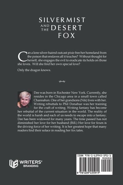 Can a lone silver-haired outcast pixie free her homeland from the poison that enslaves all it touches? Without thought for herself, she engages the evil to eradicate its holds on those she loves. Will she find her own special love? Only the dragon knows. Dee was born in Rochester New York. Currently, she resides in the Chicago area in a small town called Channahon. One of her grandsons (Nik) lives with her. Writing rebuttals to Phil Donahue was her training for the craft of writing. Writing fantasy has become her rebuttal of the current situation in the world. The reality of the world is harsh and each of us needs to escape into a fantasy. Dee has been widowed for many years. The time passed has not diminished her love for her husband (Bill.) Her love for foxes is the driving force of her writing. It is her greatest hope that many readers find their solace in reading her fox tales.