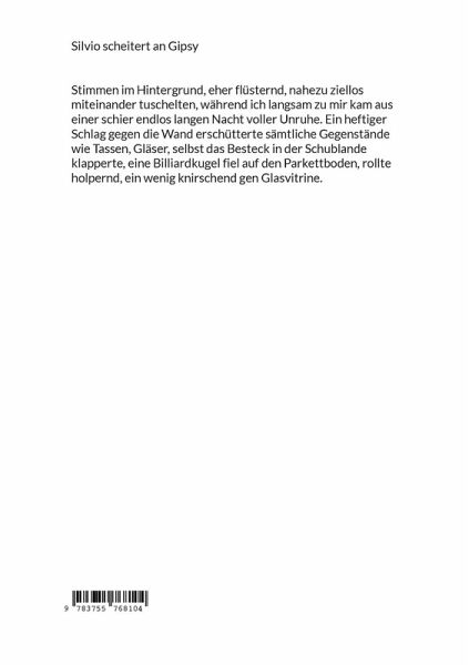 Silvio scheitert an GipsyStimmen im Hintergrund, eher flüsternd, nahezu ziellos miteinander tuschelten, während ich langsam zu mir kam aus einer schier endlos langen Nacht voller Unruhe. Ein heftiger Schlag gegen die Wand erschütterte sämtliche Gegenstände wie Tassen, Gläser, selbst das Besteck in der Schublande klapperte, eine Billiardkugel fiel auf den Parkettboden, rollte holpernd, ein wenig knirschend gen Glasvitrine.