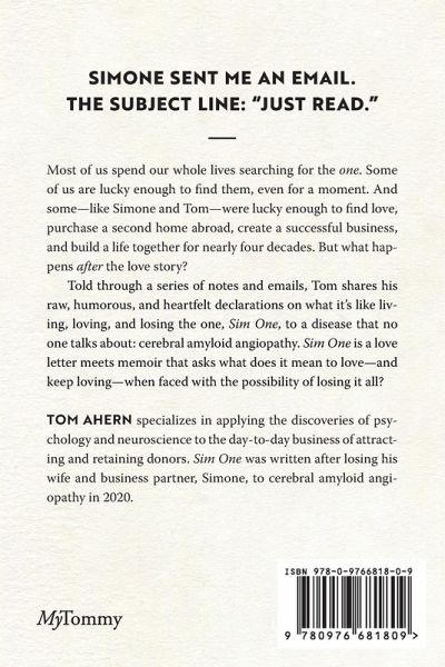 Most of us spend our whole lives searching for the one. Some of us are lucky enough to find them, even for a moment. And some-like Simone and Tom-were lucky enough to find love, purchase a second home abroad, create a successful business, and build a life together for nearly four decades. But what happens after the love story? Told through a series of notes and emails, Tom shares his raw, humorous, and heartfelt declarations on what it's like living, loving, and losing the one, Sim One, to a disease that no one talks about: cerebral amyloid angiopathy. Sim One is a love letter meets memoir that asks what does it mean to love-and keep loving-when faced with the possibility of losing it all?