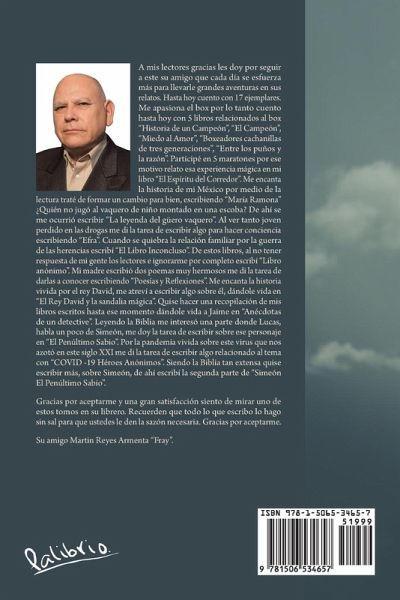A mis lectores gracias les doy por seguir a este su amigo que cada día se esfuerza más para llevarle grandes aventuras en sus relatos. Hasta hoy cuento con 17 ejemplares. Me apasiona el box por lo tanto cuento hasta hoy con 5 libros relacionados al box "Historia de un Campeón", "El Campeón", "Miedo al Amor", "Boxeadores cachanillas de tres generaciones", "Entre los puños y la razón". Participé en 5 maratones por ese motivo relato esa experiencia mágica en mi libro "El Espíritu del Corredor". Me encanta la historia de mi México por medio de la lectura traté de formar un cambio para bien, escribiendo "María Ramona" ¿Quién no jugó al vaquero de niño montado en una escoba? De ahí se me ocurrió escribir "La leyenda del güero vaquero". Al ver tanto joven perdido en las drogas me di la tarea de escribir algo para hacer conciencia escribiendo "Efra". Cuando se quiebra la relación familiar por la guerra de las herencias escribí "El Libro Inconcluso". De estos libros, al no tener respuesta de mi gente los lectores e ignorarme por completo escribí "Libro anónimo". Mi madre escribió dos poemas muy hermosos me di la tarea de darlas a conocer escribiendo "Poesías y Reflexiones". Me encanta la historia vivida por el rey David, me atreví a escribir algo sobre él, dándole vida en "El Rey David y la sandalia mágica". Quise hacer una recopilación de mis libros escritos hasta ese momento dándole vida a Jaime en "Anécdotas de un detective". Leyendo la Biblia me interesó una parte donde Lucas, habla un poco de Simeón, me doy la tarea de escribir sobre ese personaje en "El Penúltimo Sabio". Por la pandemia vivida sobre este virus que nos azotó en este siglo XXI me di la tarea de escribir algo relacionado al tema con "COVID -19 Héroes Anónimos". Siendo la Biblia tan extensa quise escribir más, sobre Simeón, de ahí escribí la segunda parte de "Simeón El Penúltimo Sabio". Gracias por aceptarme y una gran satisfacción siento de mirar uno de estos tomos en su librero. Recuerden que todo lo que escribo lo hago sin sal para que ustedes le den la sazón necesaria. Gracias por aceptarme. Su amigo Martin Reyes Armenta "Fray".