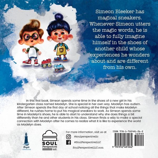 Simeon Bleeker has magical sneakers. Whenever Simeon utters the magic words, he is able to fully imagine himself in the shoes of another child whose experiences he wonders about and are different from his own. In this first book, Simeon spends some time in the shoes of a new girl in his kindergarten class named Madelyn. She is special in her own way. Madelyn has autism. After Simeon spends the first day of school noticing all the things that make Madelyn different, he rushes home to put his magical sneakers to work. As Simeon spends some time in Madelyn's shoes, he is able to start to understand why she does things a bit differently than he and other students in his class. Simeon finds a way to make a special connection with Madelyn after he comes to realize what it is like to experience the world as Madelyn does.
