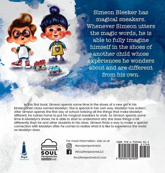 Simeon Bleeker has magical sneakers. Whenever Simeon utters the magic words, he is able to fully imagine himself in the shoes of another child whose experiences he wonders about and are different from his own. In this first book, Simeon spends some time in the shoes of a new girl in his kindergarten class named Madelyn. She is special in her own way. Madelyn has autism. After Simeon spends the first day of school noticing all the things that make Madelyn different, he rushes home to put his magical sneakers to work. As Simeon spends some time in Madelyn's shoes, he is able to start to understand why she does things a bit differently than he and other students in his class. Simeon finds a way to make a special connection with Madelyn after he comes to realize what it is like to experience the world as Madelyn does.