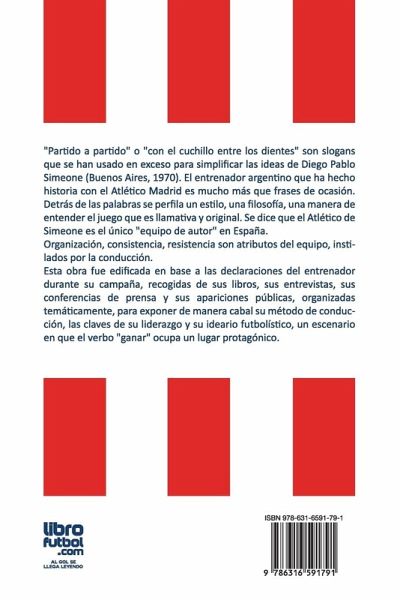 "Partido a partido" o "con el cuchillo entre los dientes" son slogans que se han usado en exceso para simplificar las ideas de Diego Pablo Simeone (Buenos Aires, 1970). El entrenador argentino que ha hecho historia con el Atlético Madrid es mucho más que frases de ocasión. Detrás de las palabras se perfila un estilo, una filosofía, una manera de entender el juego que es llamativa y original. Se dice que el Atlético de Simeone es el único "equipo de autor" en España. Organización, consistencia, resistencia son atributos del equipo, instilados por la conducción. Esta obra fue edificada en base a las declaraciones del entrenador durante su campaña, recogidas de sus libros, sus entrevistas, sus conferencias de prensa y sus apariciones públicas, organizadas temáticamente, para exponer de manera cabal su método de conducción, las claves de su liderazgo y su ideario futbolístico, un escenario en que el verbo "ganar" ocupa un lugar protagónico.