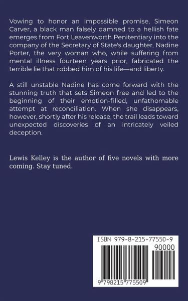 Vowing to honor an impossible promise, Simeon Carver, a black man falsely damned to a hellish fate, emerges from Fort Leavenworth Penitentiary into the company of the Secretary of State's daughter, Nadine Porter, the very woman who, while suffering from mental illness fourteen years prior, fabricated the terrible lie that robbed him of his life—and liberty. A still unstable Nadine has come forward with the stunning truth that sets Simeon free and led to the beginning of their emotion-filled, unfathomable attempt at reconciliation. When she disappears, however, shortly after his release, the trail leads toward unexpected discoveries of an intricately veiled deception. A deception that makes men loyal to Nadine's father eager to kill to keep it secret. And the life of an orphaned ex-convict means less than nothing to any of them.