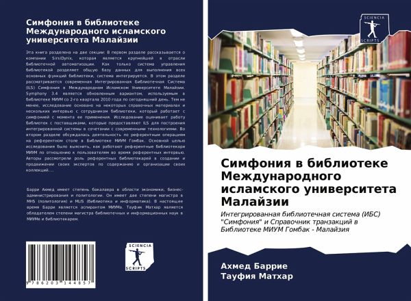Jeta kniga razdelena na dwe sekcii: V perwom razdele rasskazywaetsq o kompanii SirsiDynix, kotoraq qwlqetsq krupnejshej w otrasli bibliotechnoj awtomatizacii. Kak tol'ko sistema uprawleniq bibliotekoj razdelqet obschuü bazu dannyh dlq wypolneniq wseh osnownyh funkcij biblioteki, sistema integriruetsq. V ätom razdele rassmatriwaetsq sowremennaq Integrirowannaq Bibliotechnaq Sistema (ILS) Simfoniq w Mezhdunarodnom Islamskom Uniwersitete Malajzii. Symphony 3.4 qwlqetsq obnowlennym wariantom, ispol'zuemym w biblioteke MIUM so 2-go kwartala 2010 goda po segodnqshnij den'. Tem ne menee, issledowanie osnowano na nekotoryh sprawochnyh materialah i neskol'kih interw'ü s sotrudnikom biblioteki, kotoryj rabotaet s simfoniej s momenta ee primeneniq. Issledowanie oceniwaet rabotu bibliotek s postawschikami, kotorye predostawlqüt ILS dlq postroeniq integrirowannoj sistemy w sochetanii s sowremennymi tehnologiqmi. Vo wtorom razdele obsuzhdalas' deqtel'nost' po referentnym operaciqm na referentnom stole w Biblioteke MIUM Gombak. Osnownoj cel'ü issledowaniq bylo wyqsnit', kak rabotaüt referentnye bibliotekari MIUM po otnosheniü k pol'zowatelqm wo wremq referentnyh interw'ü. Awtory rassmotreli rol' referentnyh bibliotekarej w sozdanii i prodwizhenii swoih äxpertow po soderzhaniü i organizacii swoih kollekcij....