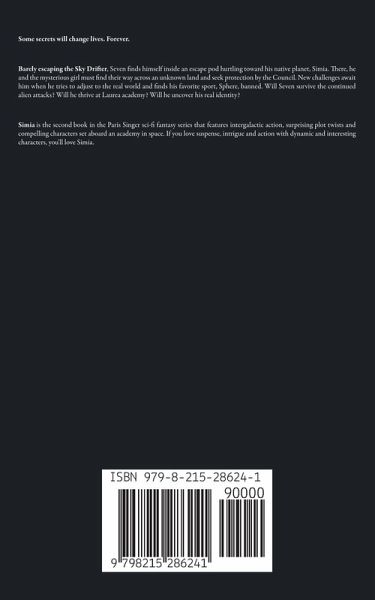 Some secrets will change lives. Forever. Barely escaping the Sky Drifter, Seven finds himself inside an escape pod hurtling toward his native planet, Simia. There, he and the mysterious girl must find their way across an unknown land and seek protection by the Council. New challenges await him when he tries to adjust to the real world and finds his favorite sport, Sphere, banned. Will Seven survive the continued alien attacks? Will he thrive at Laurea academy? Will he uncover his real identity? Simia is the second book in the Paris Singer sci-fi fantasy series that features intergalactic action, surprising plot twists and compelling characters set aboard an academy in space. If you love suspense, intrigue and action with dynamic and interesting characters, you'll love Simia.