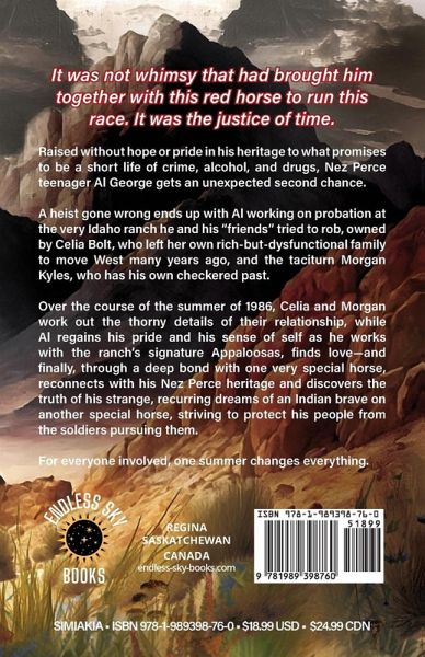 It was not whimsy that had brought him together with this red horse to run this race. It was the justice of time. Raised without hope or pride in his heritage to what promises to be a short life of crime, alcohol, and drugs, Nez Perce teenager Al George gets an unexpected second chance. A heist gone wrong ends up with him working on probation at the very Idaho ranch he and his "friends" tried to rob, owned by Celia Bolt, who left her own rich-but-dysfunctional family to move West many years ago, and the taciturn Morgan Kyles, who has his own checkered past. Over the course of the summer of 1986, Celia and Morgan work out the thorny details of their relationship, while Al regains his pride and his sense of self as he works with the ranch's signature Appaloosas, finds love-and finally, through a deep bond with one very special horse, reconnects with his Nez Perce heritage and discovers the truth of his strange, recurring dreams of an Indian brave on a very special horse, striving to protect his people from the soldiers pursuing them. For everyone involved, one summer changes everything.