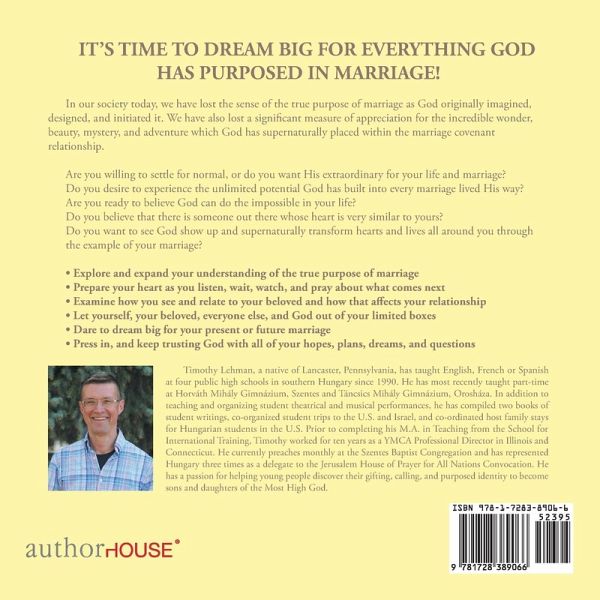 IT'S TIME TO DREAM BIG FOR EVERYTHING GOD HAS PURPOSED IN MARRIAGE! In our society today, we have lost the sense of the true purpose of marriage as God originally imagined, designed, and initiated it. We have also lost a significant measure of appreciation for the incredible wonder, beauty, mystery, and adventure which God has supernaturally placed within the marriage covenant relationship. Are you willing to settle for normal, or do you want His extraordinary for your life and marriage? Do you desire to experience the unlimited potential God has built into every marriage lived His way? Are you ready to believe God can do the impossible in your life? Do you believe that there is someone out there whose heart is very similar to yours? Do you want to see God show up and supernaturally transform hearts and lives all around you through the example of your marriage? ¿ Explore and expand your understanding of the true purpose of marriage ¿ Prepare your heart as you listen, wait, watch, and pray about what comes next ¿ Examine how you see and relate to your beloved and how that affects your relationship ¿ Let yourself, your beloved, everyone else, and God out of your limited boxes ¿ Dare to dream big for your present or future marriage ¿ Press in, and keep trusting God with all of your hopes, plans, dreams, and questions