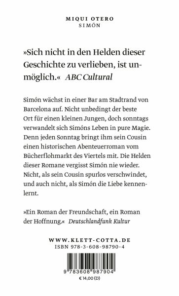 Simón wächst, weitgehend sich selbst überlassen, in einer Bar am Stadtrand von Barcelona auf. Nicht unbedingt der beste Ort für einen kleinen Jungen, doch sonntags verwandelt sich Simóns Leben in pure Magie. Denn jeden Sonntag bringt ihm sein Cousin einen historischen Abenteuerroman vom Bücherflohmarkt des Viertels mit. Die Helden dieser Romane vergisst Simón nie wieder. Nicht, als sein Cousin spurlos verschwindet, und auch nicht, als Simón die Liebe kennenlernt und sich als Koch in Luxusküchen verdingt. Doch weder die strahlende Stadt ist vor der Entzauberung gefeit, noch Simóns eigenes Leben. Miqui Otero hat mit diesem zärtlichen, mehrere Jahrzehnte umspannenden Familienroman nicht nur seinem Helden Simón und der sinnstiftenden Kraft der Literatur, sondern auch seiner Heimatstadt Barcelona ein Denkmal gesetzt.