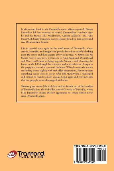 In the second book in the Dreamville series, thirteen-year-old Simon Dreamlee's life has returned to normal Dreamvillian standards after he and his friends Jilla MusiDream, Almont Alldream, and Rino DreamScifi finally manage to restore Dreamville's deep dark secrets and save Dreamvillians dreams. Life is peaceful once again in the small town of Dreamville, where artistic, scientific, and imaginative people dressed in colorful clothing roam the streets and their dreams always come true. As Simon and his friends receive their royal invitations to King Régimand DreamRoyal and Miss LossDream's wedding nuptials, Simon is still observing the house on the hill through his telescope and notices bizarre changes in the gargoyle statues that surround the home. When he notes the statues are shifting ever so slightly with each of his observations, Simon suspects something odd is about to occur. After Jilla MusiDream is kidnapped and cannot be found, Simon's dreams begin again and convince him that the gargoyle statues kidnapped his friend. Simon's quest to save Jilla leads him and his friends out of the comfort of Dreamville into the forbidden outsider's world of Newville, where Miss DreamNot makes another appearance to ensure Simon never saves Dreamville again.