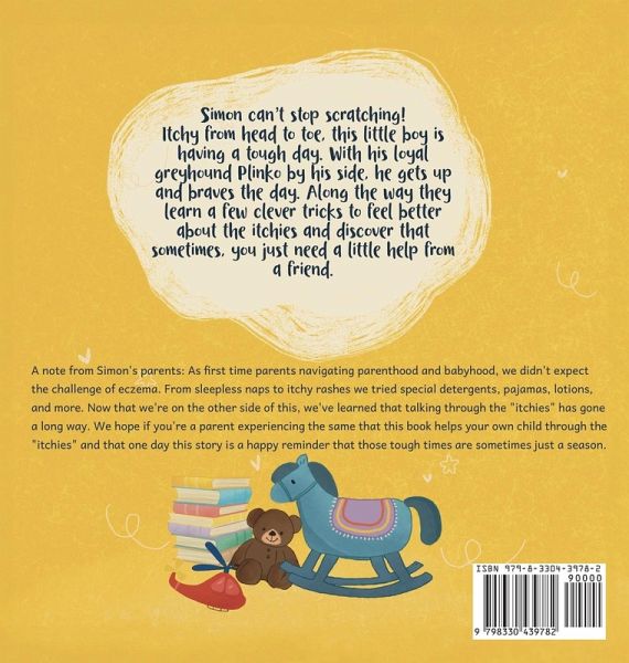 Simon can't stop scratching! Itchy from head to toe, this little boy is having a tough day. With his loyal greyhound Plinko by his side, he gets up and braves the day. Along the way they learn a few clever tricks to feel better about the itchies and discover that sometimes, you just need a little help from a friend.