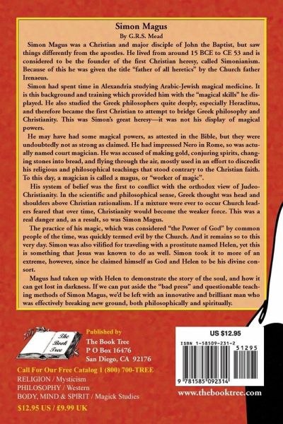 Simon Magus was originally a Christian and disciple of John the Baptist, but broke off and formed the first Christian heresy, called Simonianism. After learning magical medicine in Alexandria he was considered to have many magical skills. To this day, a skilled magician is called a "magus." He also studied Greek philosophers, especially Heraclitus, and became the first Christian to attempt to bridge Greek philosophy and Christianity. If a mixture ever occurred Church leaders feared they would become weaker over time and not survive. According to Mead, this was Simon's great heresy -- not his magic. This interesting book shows Simon Magus to have been a brilliant man who was breaking new ground, both philosophically and spiritually.