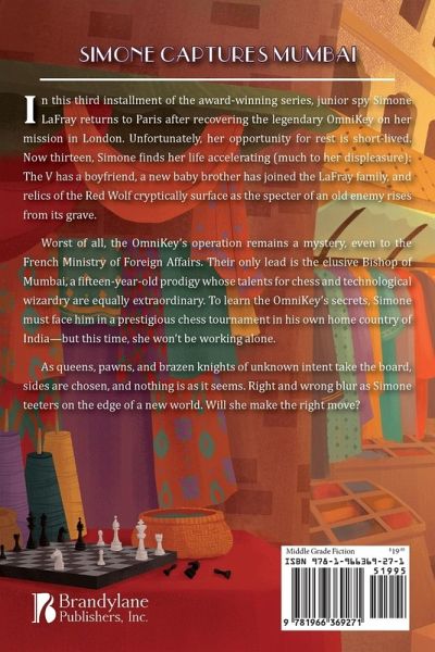 Simone captures Mumbai In this third installment of the award-winning series, junior spy Simone LaFray returns to Paris after recovering the legendary OmniKey on her mission in London. Unfortunately, her opportunity for rest is short-lived. Now thirteen, Simone finds her life accelerating (much to her displeasure): The V has a boyfriend, a new baby brother has joined the LaFray family, and relics of the Red Wolf cryptically surface as the specter of an old enemy rises from its grave. Worst of all, the OmniKey's operation remains a mystery, even to the French Ministry of Foreign Affairs. Their only lead is the elusive Bishop of Mumbai, a fifteen-year-old prodigy whose talents for chess and technological wizardry are equally extraordinary. To learn the OmniKey's secrets, Simone must face him in a prestigious chess tournament in his own home country of India-but this time, she won't be working alone. As queens, pawns, and brazen knights of unknown intent take the board, sides are chosen, and nothing is as it seems. Right and wrong blur as Simone teeters on the edge of a new world. Will she make the right move?
