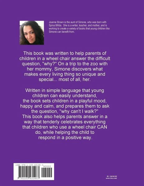 This book was written to help parents of children who use a wheel chair answer the difficult question, "why?" On a trip to the zoo with her mommy, Simone discovers what makes every living thing so unique and special... most of all, her. Written in simple language that young children can easily understand, the book sets children in a playful mood, happy and calm, and prepares them to ask the question, "why can't I walk?" This book also helps parents answer in a way that tenderly celebrates everything that children who use a wheel chair CAN do, while helping the child to respond in a positive way.