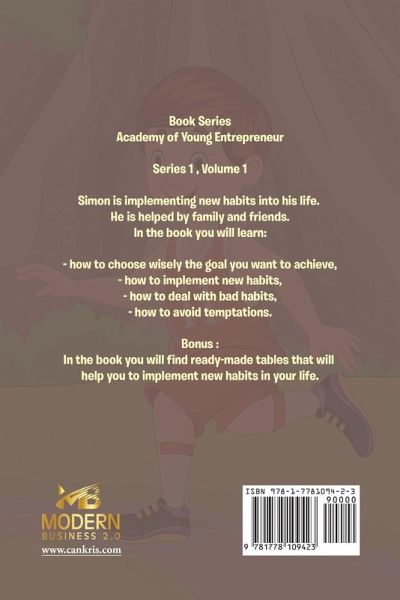 Thanks to the book "Simon New Habits" from the Academy of Young Entrepreneur series, publisher of Modern Business 2.0 ( www.cankris.com). Your child will not have to wait until full maturity to start learning how to start making financially intelligent and wise decisions. This book provides the necessary knowledge to ensure that a young person will not be unnecessarily exposed to financial mistakes and failures in the future. The adventures of Simon and Holly, described in a simple and friendly manner, help to learn basic economic concepts so that your child: will grow up to be an aware and reasonable adult, become entrepreneurial, resourceful, and self-confident, make wise decisions in every aspect of life, won't have to learn from their mistakes. Simon is implementing new habits into his life. He is helped by family and friends. In the book you will learn: - how to choose wisely the goal you want to achieve, - how to implement new habits, - how to deal with bad habits, - how to avoid temptations. Bonus : In the book, you will find ready-made tables that will help you to implement new habits in your life. You probably wish that your child: - grow up to be a conscious and sensible adult, - to be enterprising, resourceful and self-confident, - to make wise decisions in every aspect of his/her life,