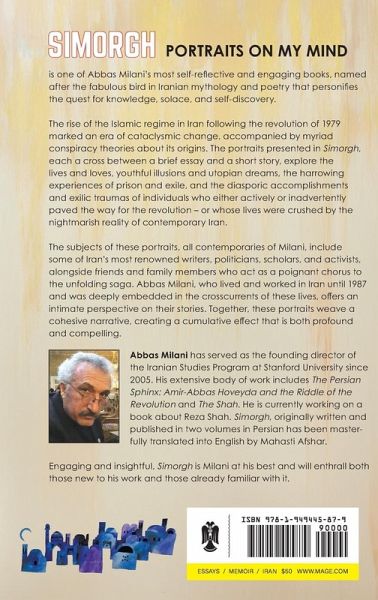 Simorgh: Portraits on My Mind is one of Abbas Milani's most self-reflective and engaging books, named after the fabulous bird in Iranian mythology and poetry that personifies the quest for knowledge, solace, and self-discovery. The rise of the Islamic regime in Iran following the revolution of 1979 marked an era of cataclysmic change, accompanied by myriad conspiracy theories about its origins. The portraits presented in Simorgh, each a cross between a brief essay and a short story, explore the lives and loves, youthful illusions and utopian dreams, the harrowing experiences of prison and exile, and the diasporic accomplishments and exilic traumas of individuals who either actively or inadvertently paved the way for the revolution - or whose lives were crushed by the nightmarish reality of contemporary Iran. The subjects of these portraits, all contemporaries of Milani, include some of Iran's most renowned writers, politicians, scholars, and activists, alongside friends and family members who act as a poignant chorus to the unfolding saga. Abbas Milani, who lived and worked in Iran until 1987 and was deeply embedded in the crosscurrents of these lives, o ers an intimate perspective on their stories. Together, these portraits weave a cohesive narrative, creating a cumulative e ect that is both profound and compelling. Abbas Milani has served as the founding director of the Iranian Studies Program at Stanford University since 2005. His extensive body of work includes The Persian Sphinx: Amir-Abbas Hoveyda and the Riddle of the Revolution and The Shah. He is currently working on a book about Reza Shah. Simorgh, originally written and published in two volumes in Persian has been masterfully translated into English by Mahasti Afshar. Engaging and insightful, Simorgh is Milani at his best and will enthrall both those new to his work and those already familiar with it.