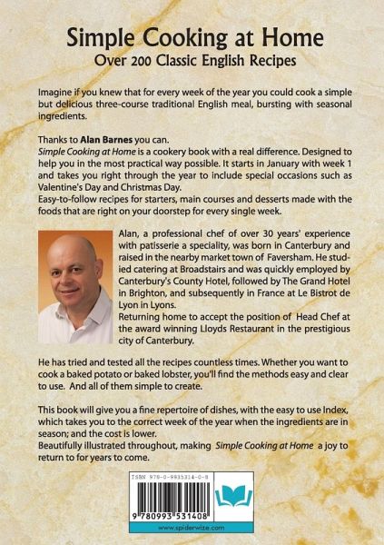 Imagine if you knew that for every week of the year you could cook a simple but delicious three-course traditional English meal, bursting with seasonal ingredients. Thanks to Alan Barnes you can. Simple Cooking at Home is a cookery book with a real difference. Designed to help you in the most practical way possible. It starts in January with week 1 and takes you right through the year to include special occasions such as Valentine's Day and Christmas Day. Easy-to-follow recipes for starters, main courses and desserts made with the foods that are right on your doorstep for every single week. Alan, a professional chef of over 30 years' experience with patisserie a speciality, was born in Canterbury and raised in the nearby market town of Faversham. He studied catering at Broadstairs and was quickly employed by Canterbury's County Hotel, followed by The Grand Hotel in Brighton, and subsequently in France at Le Bistrot de Lyon in Lyons. Returning home to accept the position of Head Chef at the award winning Lloyds Restaurant in the prestigious city of Canterbury. He has tried and tested all the recipes countless times. Whether you want to cook a baked potato or baked lobster, you'll find the methods easy and clear to use. And all of them simple to create. This book will give you a fine repertoire of dishes, with the easy to use Index, which takes you to the correct week of the year when the ingredients are in season; and the cost is lower. Beautifully illustrated throughout, making Simple Cooking at Home a joy to return to for years to come. Makes an ideal birthday or anniversary gift.