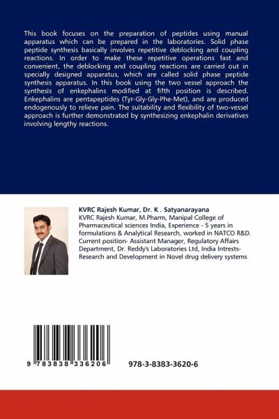 This book focuses on the preparation of peptides using manual apparatus which can be prepared in the laboratories. Solid phase peptide synthesis basically involves repetitive deblocking and coupling reactions. In order to make these repetitive operations fast and convenient, the deblocking and coupling reactions are carried out in specially designed apparatus, which are called solid phase peptide synthesis apparatus. In this book using the two vessel approach the synthesis of enkephalins modified at fifth position is described. Enkephalins are pentapeptides (Tyr-Gly-Gly-Phe-Met), and are produced endogenously to relieve pain. The suitability and flexibility of two-vessel approach is further demonstrated by synthesizing enkephalin derivatives involving lengthy reactions.