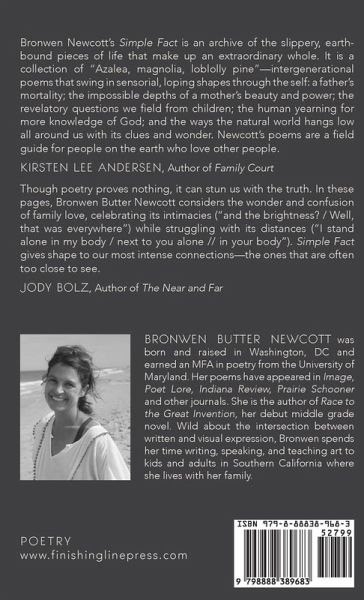 In Simple Fact, Bronwen Newcott explores the intricacies of family over generations, "the daughter-mother-sun / rising on repeat." The collection is a meditation between the seen and the unseen, the "simple fact" and "shadow between... fingers," insisting that muscular love exists between the two. Newcott's play forward and backwards in time allows mother and father to be specific, vocational, and archetypal at once. From a juicy orange dripping to the elbow, to the chalky scrim of loss that shadows a generation, Newcott's poems seek "small sweet proof" that we are living.
