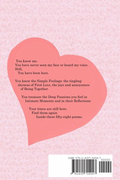 These fifty-eight romantic poems tell a love story from first love to intimate moments to the reflections of a lasting relationship. They are all from a real romance, so the feelings and moments they relate vary from light and casual to intensely intimate. The style is direct, personal, and accessible.