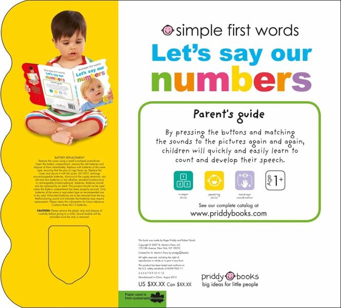 Roger Priddy's Simple First Words Let's Say Our Numbers is an adorable, effective introduction to first words and numbers. By pressing the buttons and matching the sounds to the pictures again and again, children will quickly and easily learn to count and develop their speech with this interactive board book. Bright photographs and questions to encourage learning on every page make counting fun. Now with even clearer audio!