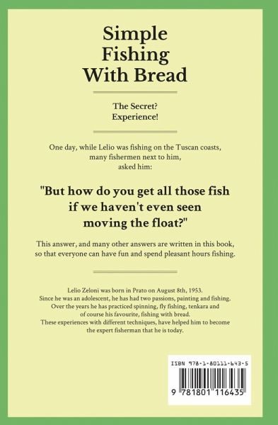 One day, while Lelio was fishing on the Tuscan coasts, many fishermen who were next to him to observe asked him: "But how can you get all those fish, if we haven't even seen the float move?" This answer, and many others answers are written in this book, so that everyone can have fun and spend pleasant hours fishing. "The principle states that about 20% of causes create 80% of effects. So, 80% of what we get is caused by only 20% of what we do. In every field or sector, most of the effects are caused by a limited number of causes. So, you will notice with great surprise that 80% of the world's wealth is held by 20% of the population, 80% of a company's earnings are generated by 20% of the sales, 80% of your results are generated by 20% of your actions.This principle is present in many areas of our life. Even fishing is not immune to this principle.This book perfectly embodies the principle of Pareto. These pages, that are written in a very simple way, are very effective, they are the essence of experience that will teach you that 20% will give you 80% of the value, leaving out all that is irrelevant and unnecessary for successful fishing." Dr. Edoardo Zeloni Magelli This easy to learn book wants to be a useful guide both for those who want to start fishing with bread, and for the more experienced fishermen who want to improve their fishing skills. In these pages you will find very practical tips on how to fish with bread,you will find advice on the various types of floats and the best ones to use, both in calm and rough seas, and on the length of the rods to use which will depend on where we choose to go fishing. I will teach you how to recognize the suitable places for fishing, teaching you how to use your logic, but above all, you will understand when it is time to go fishing by observing the tides. Order Now and Start Fishing!