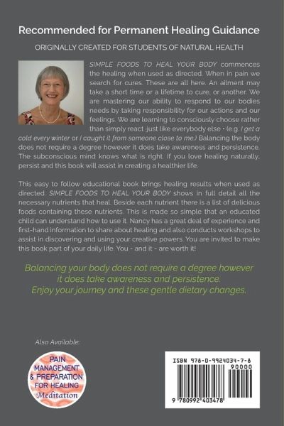 ORIGINALLY CREATED FOR STUDENTS OF NATURAL HEALTH. SIMPLE FOODS TO HEAL YOUR BODY improves healing when used as directed. When in pain we search for cures. These are all here. An ailment may take a short time or a lifetime to cure, or another. We can master our ability to respond to our bodies' needs. If you love healing naturally, persist and welcome this book to assist in creating your healthier life. e.g. if you get a cold every winter, you will discover how not to. This easy to follow educational book is simple and straight to the point. You will discover what nutrient is lacking with each ailment. SIMPLE FOODS TO HEAL YOUR BODY shows in full detail all the necessary nutrients that heal specific dis-eases. Beside each ailment is a list of nutrients that heal and beside each nutrient there is a list of delicious foods containing high levels of these healing nutrients. You are invited to make this book part of your daily life. You - and it - are worth it! You will enjoy eating your way to good.health. Take this book with you when shopping. It is the BEST SHOPPING GUIDE FOR TREATING MANY AILMENTS FROM A -Z.