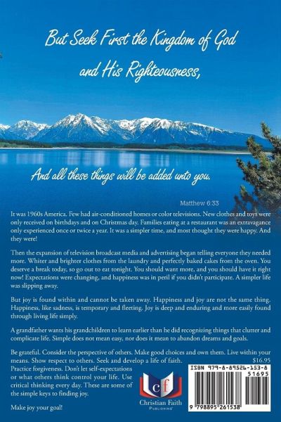 It was 1960s America. Few had air-conditioned homes or color televisions. New clothes and toys were only received on birthdays and on Christmas day. Families eating at a restaurant was an extravagance only experienced once or twice a year. It was a simpler time, and most thought they were happy. And they were! Then the expansion of television broadcast media and advertising began telling everyone they needed more. Whiter and brighter clothes from the laundry and perfectly baked cakes from the oven. You deserve a break today, so go out to eat tonight. You should want more, and you should have it right now! Expectations were changing, and happiness was in peril if you didn't participate. A simpler life was slipping away. But joy is found within and cannot be taken away. Happiness and joy are not the same thing. Happiness, like sadness, is temporary and fleeting. Joy is deep and enduring and more easily found through living life simply. A grandfather wants his grandchildren to learn earlier than he did recognizing things that clutter and complicate life. Simple does not mean easy, nor does it mean to abandon dreams and goals. Be grateful. Consider the perspective of others. Make good choices and own them. Live within your means. Show respect to others. Seek and develop a life of faith. Practice forgiveness. Don't let self-expectations or what others think control your life. Use critical thinking every day. These are some of the simple keys to finding joy. Make joy your goal!