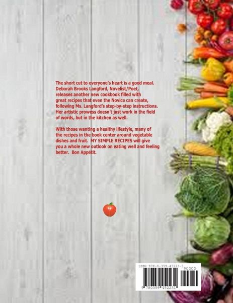 The short cut to everyone's heart is a good meal. Deborah Brooks Langford, Novelist/Poet, releases another new cookbook filled with great recipes that even the Novice can create, following Ms. Langford's step-by-step instructions. Her artistic prowess doesn't just work in the field of words, but in the kitchen as well. With those wanting a healthy lifestyle, many of the recipes in the book center around vegetable dishes and fruit. MY SIMPLE RECIPES will give you a whole new outlook on eating well and feeling better. Bon Appétit.