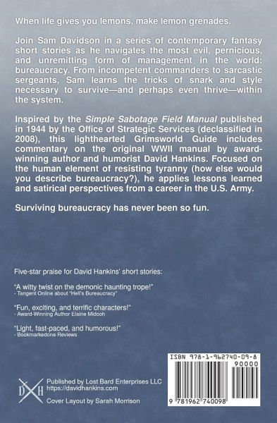 When life gives you lemons, make lemon grenades. Join Sam Davidson in a series of contemporary fantasy short stories as he navigates the most evil, pernicious, and unremitting form of management in the world: bureaucracy. From incompetent commanders to sarcastic sergeants, Sam learns the tricks of snark and style necessary to survive-and perhaps even thrive-within the system. Inspired by the Simple Sabotage Field Manual published in 1944 by the Office of Strategic Services (declassified in 2008), this lighthearted Grimsworld Guide includes commentary on the original WWII manual by award-winning author and humorist David Hankins. Focused on the human element of resisting tyranny (how else would you describe bureaucracy?), he applies lessons learned and satirical perspectives from a career in the U.S. Army. Surviving bureaucracy has never been so fun. Five-star praise for David Hankins' short stories: "A witty twist on the demonic haunting trope!" - Tangent Online about "Hell's Bureaucracy" "Fun, exciting, and terrific characters!" - Award-Winning Author Elaine Midcoh "Light, fast-paced, and humorous!" - Bookmarkedone Reviews