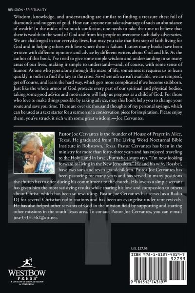 Wisdom, knowledge, and understanding are similar to finding a treasure chest full of diamonds and nuggets of gold. How can anyone not take advantage of such an abundance of wealth? In the midst of so much confusion, one needs to take the time to believe that there is wealth in the word of God and from his people to overcome such daily adversaries. We are challenged in our everyday lives, but may you take that first step of faith living for God and in helping others with love where there is failure. I know many books have been written with different opinions and advice by different writers about God and life. As the author of this book, I've tried to give some simple wisdom and understanding in so many areas of our lives, making it simple to understand-and, of course, with some sense of humor. As one who goes alone through the maze of life, sometimes it requires us to learn quickly in order to find the key to the cross. So where advice isn't available, we are tempted, get off course, and learn the hard way, which gets more complicated if we become stubborn. Just like the whole armor of God protects every part of our spiritual and physical bodies, taking some good advice and motivation will help us progress as a child of God. For those who love to make things possible by taking advice, may this book help you to change your route and save you time. There are over six thousand thoughts of my personal sayings, which can be used as a text starter for a sermon or a conservation piece for inspiration. Please enjoy them; you've struck it rich with some great wisdom.-Joe Cervantes.