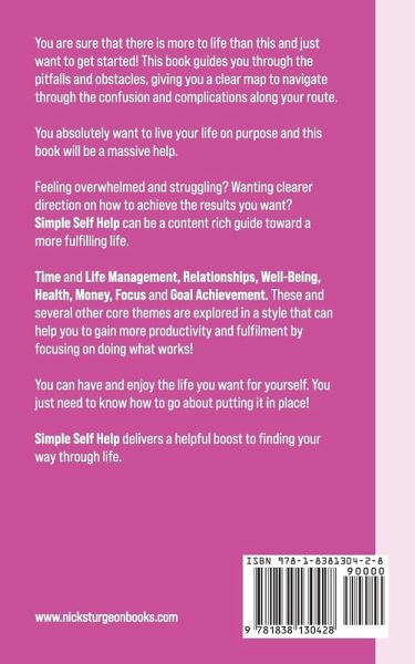 You're sure that there is more to life than this and just want to get started! This book guides you through the pitfalls and obstacles, giving you a clear map to navigate through the confusion and complications along your route. You absolutely want to live your life on purpose and this book will be a massive help. Feeling overwhelmed and struggling? Wanting clearer direction on how to achieve the results you want? Simple Self Help can be a content rich guide toward a more fulfilling life. Time and Life Management, Relationships, Well-Being, Health, Money, Focus and Goal Achievement. These and several other core themes are explored in a style that can help you to gain more productivity and fulfilment by focusing on doing what works! You can have and enjoy the life you want for yourself. You just need to know how to go about putting it in place! Simple Self Help delivers a helpful boost to finding your way through life.