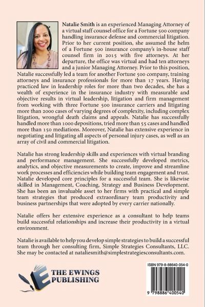 Natalie Smith is an experienced Managing Attorney of a virtual staff counsel office for a Fortune 500 company handling insurance defense and commercial litigation. Prior to her current position, she assumed the helm of a Fortune 500 insurance company's in-house staff counsel firm in 2015 with five attorneys. At her departure, the office was virtual and had ten attorneys and a junior Managing Attorney. Prior to this position, Natalie successfully led a team for another Fortune 500 company, training attorneys and insurance professionals for more than 17 years. Having practiced law in leadership roles for more than two decades, she has a wealth of experience in the insurance industry with measurable and objective results in virtual leadership, litigation and firm management from working with three Fortune 500 insurance carriers and litigating more than 2000 cases of varying degrees of complexity, including complex litigation, wrongful death claims and appeals. Natalie has successfully handled more than 1000 depositions, tried more than 55 cases and handled more than 150 mediations. Moreover, Natalie has extensive experience in negotiating and litigating all aspects of personal injury cases, as well as an array of civil and commercial litigation. Natalie has strong leadership skills and experiences with virtual branding and performance management. She successfully developed metrics, analytics, and objective measurements to create, improve and streamline work processes and efficiencies while building team engagement and trust. Natalie developed core principles for a successful team. She is likewise skilled in Management, Coaching, Strategy and Business Development. She has been an invaluable asset to her firms with practical and simple team strategies that produced extraordinary team productivity and business partnerships that were adopted by every carrier nationally. Natalie offers her extensive experience as a consultant to help teams build successful relationships and increase their productivity in a virtual environment. Natalie is available to help you develop simple strategies to build a successful team through her consulting firm, Simple Strategies Consultants, LLC.