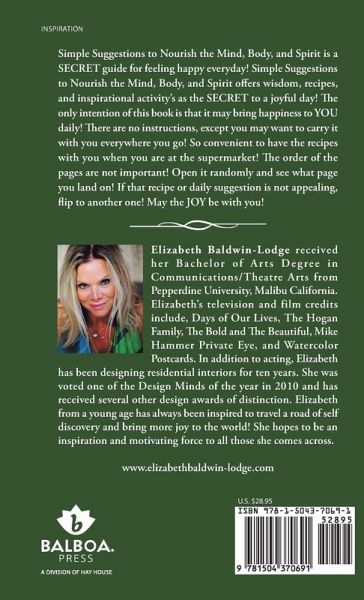 Simple Suggestions to Nourish the Mind, Body, and Spirit is a SECRET guide for feeling happy everyday! Simple Suggestions to Nourish the Mind, Body, and Spirit offers wisdom, recipes, and inspirational activity’s as the SECRET to a joyful day! The only intention of this book is that it may bring happiness to YOU daily! There are no instructions, except you may want to carry it with you everywhere you go! So convenient to have the recipes with you when you are at the supermarket! The order of the pages are not important! Open it randomly and see what page you land on! If that recipe or daily suggestion is not appealing, flip to another one! May the JOY be with you!