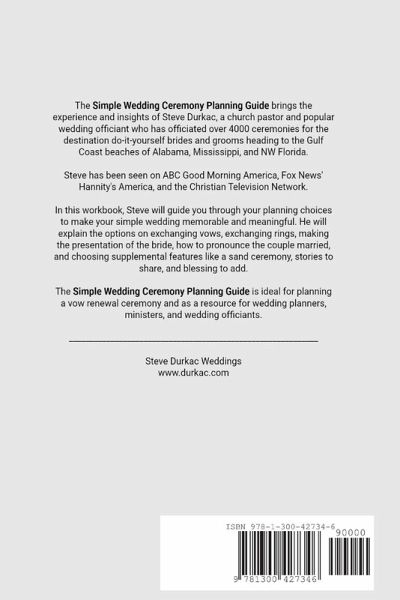 The Simple Wedding Ceremony Planning Guide brings the experience and insights of Steve Durkac, a church pastor and popular beach wedding officiant who has officiated over 4000 ceremonies for destination do-it-yourself brides and grooms along the Gulf Coast of Alabama, Mississippi, and NW Florida. Steve has been seen on ABC Good Morning America, Fox News' Hannity's America, and the Christian Television Network. In this workbook, Steve will guide you in choosing your most meaningful and memorable ways to exchange vows, rings, presentation, pronouncements, and special features like the sand ceremony.
