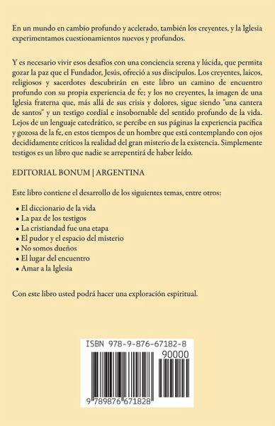 En un mundo en cambio profundo y acelerado, también los creyentes, y la Iglesia experimentamos cuestionamientos nuevos y profundos. Y es necesario vivir esos desafíos con una conciencia serena y lúcida, que permita gozar la paz que el Fundador, Jesús, ofreció a sus discípulos. Los creyentes, laicos, religiosos y sacerdotes descubrirán en este libro un camino de encuentro profundo con su propia experiencia de fe; y los no creyentes, la imagen de una Iglesia fraterna que, más allá de sus crisis y dolores, sigue siendo "una cantera de santos" y un testigo cordial e insobornable del sentido profundo de la vida. Lejos de un lenguaje catedrático, se percibe en sus páginas la experiencia pacífica y gozosa de la fe, en estos tiempos de un hombre que está contemplando con ojos decididamente críticos la realidad del gran misterio de la existencia. Simplemente testigos es un libro que nadie se arrepentirá de haber leído. EDITORIAL BONUM ARGENTINA Este libro contiene el desarrollo de los siguientes temas, entre otros:El diccionario de la vida La paz de los testigos La cristiandad fue una etapa El pudor y el espacio del misterio No somos dueños El lugar del encuentro Amar a la Iglesia Con este libro usted podrá hacer una exploración espiritual.