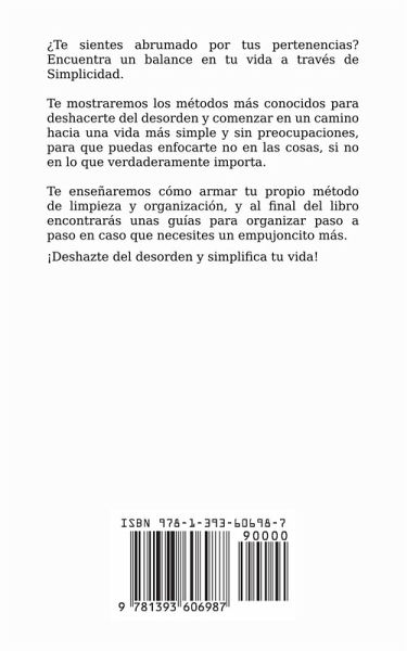 ¿Te sientes abrumado por tus pertenencias? Encuentra un balance en tu vida a través de Simplicidad. Te mostraremos los métodos más conocidos para deshacerte del desorden y comenzar en un camino hacia una vida más simple y sin preocupaciones, para que puedas enfocarte no en las cosas, si no en lo que verdaderamente importa. Te enseñaremos cómo armar tu propio método de limpieza y organización, y al final del libro encontrarás unas guías para organizar paso a paso en caso que necesites un empujoncito más. ¡Deshazte del desorden y simplifica tu vida!