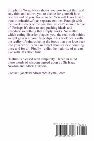 Most programs require you to eat their foods; take their supplements; eat this - don't eat that; count calories; don't eat after 8:00PM (even if you're up till 12:00); or require exercise that you'll never fit into your life. And, you still have cravings. Simplicity Weight-loss/A 21st Century Diet shows you how to get thin, and stay thin, and allows you to decide how healthy and fit you choose to be. In other words - you will learn how to treat thin/healthy/fit as separate entities. This small book will also introduce you to the real truth behind eating disorders. No recipes will be shared - only priceless knowledge.