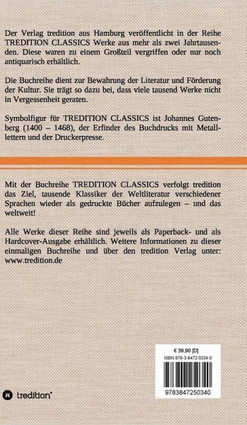 Diese Hardcover-Ausgabe ist Teil der TREDITION CLASSICS. Der Verlag tredition aus Hamburg veröffentlicht in der Buchreihe TREDITION CLASSICS Werke aus mehr als zwei Jahrtausenden. Diese waren zu einem Großteil vergriffen oder nur noch antiquarisch erhältlich. Mit TREDITION CLASSICS verfolgt tredition das Ziel, tausende Klassiker der Weltliteratur verschiedener Sprachen wieder als gedruckte Bücher zu verlegen und das weltweit! Die Buchreihe dient zur Bewahrung der Literatur und Förderung der Kultur. Sie trägt so dazu bei, dass viele tausend Werke nicht in Vergessenheit geraten.