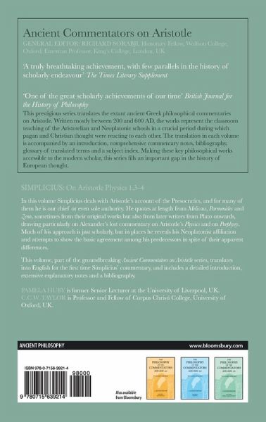 In this volume Simplicius deals with Aristotle's account of the Presocratics, and for many of them he is our chief or even sole authority. He quotes at length from Melissus, Parmenides and Zeno, sometimes from their original works but also from later writers from Plato onwards, drawing particularly on Alexander's lost commentary on Aristotle's Physics and on Porphyry. Much of his approach is just scholarly, but in places he reveals his Neoplatonist affiliation and attempts to show the basic agreement among his predecessors in spite of their apparent differences. This volume, part of the groundbreaking Ancient Commentators on Aristotle series, translates into English for the first time Simplicius' commentary, and includes a detailed introduction, extensive explanatory notes and a bibliography.