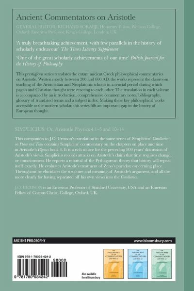 This companion to J. O. Urmson's translation in the same series of Simplicius' Corollaries on Place and Time contains Simplicius' commentary on the chapters on place and time in Aristotle's Physics book 4. It is a rich source for the preceding 800 years' discussion of Aristotle's views. Simplicius records attacks on Aristotle's claim that time requires change, or consciousness. He reports a rebuttal of the Pythagorean theory that history will repeat itself exactly. He evaluates Aristotle's treatment of Zeno's paradox concerning place. Throughout he elucidates the structure and meaning of Aristotle's argument, and all the more clearly for having separated off his own views into the Corollaries.