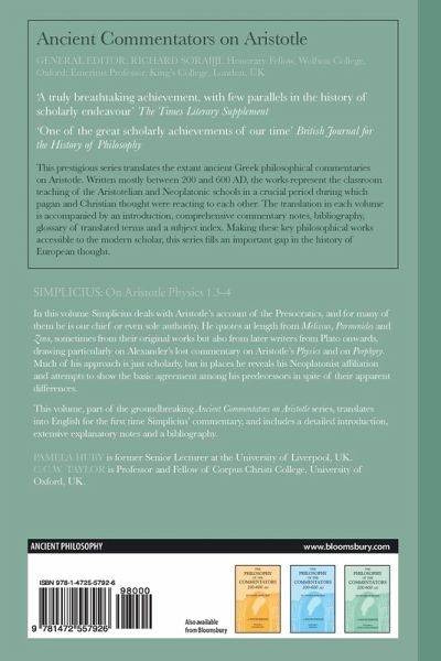 In this volume Simplicius deals with Aristotle's account of the Presocratics, and for many of them he is our chief or even sole authority. He quotes at length from Melissus, Parmenides and Zeno, sometimes from their original works but also from later writers from Plato onwards, drawing particularly on Alexander's lost commentary on Aristotle's Physics and on Porphyry. Much of his approach is just scholarly, but in places he reveals his Neoplatonist affiliation and attempts to show the basic agreement among his predecessors in spite of their apparent differences. This volume, part of the groundbreaking Ancient Commentators on Aristotle series, translates into English for the first time Simplicius' commentary, and includes a detailed introduction, extensive explanatory notes and a bibliography.