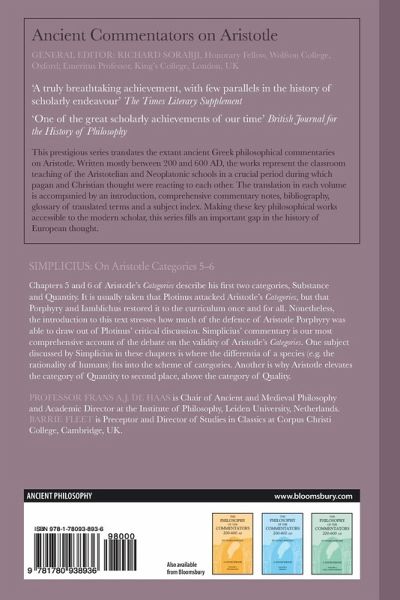 Chapters 5 and 6 of Aristotle's Categories describe his first two categories, Substance and Quantity. It is usually taken that Plotinus attacked Aristotle's Categories, but that Porphyry and Iamblichus restored it to the curriculum once and for all. Nonetheless, the introduction to this text stresses how much of the defence of Aristotle Porphyry was able to draw out of Plotinus' critical discussion. Simplicius' commentary is our most comprehensive account of the debate on the validity of Aristotle's Categories. One subject discussed by Simplicius in these chapters is where the differentia of a species (eg the rationality of humans) fits into the scheme of categories. Another is why Aristotle elevates the category of Quantity to second place, above the category of Quality. Further, de Haas shows how Simplicius distinguishes different kinds of universal order to solve some of the problems.