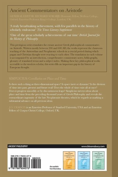 Is there such a thing as three-dimensional space? Is space inert or dynamic? Is the division of time into past, present and future real? Does the whole of time exist all at once? Does it progress smoothly or by discontinuous leaps? Simplicius surveys ideas about place and time from the preceding thousand years of Greek Philosophy and reveals the extraordinary ingenuity of the late Neoplatonist theories, which he regards as marking a substantial advance on all previous ideas.