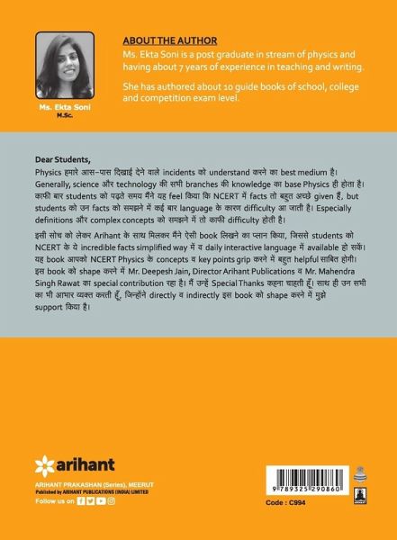 1. This book help students to understand the theories and experiments of physics 2. The book is divided into 15 chapters for class 11 3. Easy and interactive language eases the concepts for better understanding 4. Reference book that grasps all key points and concepts into a simpler manner, clearing all concepts. 5. The latest edition has been made to attain the entire physics concept in an easy and interactive language. 6. The book is developed volume wise to cater class wise needs. Competitive exams have been the new approach to life, for all students. Every good college is attainable through a National or Regional Level exam. NCERT Textbooks have become the benchmark for syllabus and theory for these exams. Every student needs to learn these textbooks by heart. But it's always compact and feels short. Simplified NCERT from Arihant is one of a kind reference book that helps the student to grasp all key points and concepts in a simple manner which is easy to retain yet clearing all concepts. Physics as a subject needs visualization to learn, the latest edition has been made in such a way that you can attain the entire Physics concept in an easy and interactive language. The book is developed volume-wise to cater to class-wise needs. TABLE OF CONTENT Physics World, Units and Measurement, Motion in a Straight Line, Motion in a Plane, Laws of Motion, Work, Power and Energy, System of Particles and Rotational Motion, Gravitation, Mechanical Properties of Solids, Mechanical Properties of Fluids, Thermal Properties of Matter, Thermodynamics, Kinetic Theory, Oscillations, Waves.