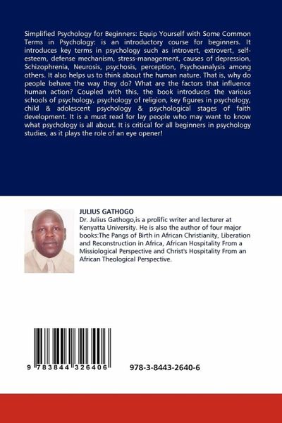 Simplified Psychology for Beginners: Equip Yourself with Some Common Terms in Psychology: is an introductory course for beginners. It introduces key terms in psychology such as introvert, extrovert, self-esteem, defense mechanism, stress-management, causes of depression, Schizophrenia, Neurosis, psychosis, perception, Psychoanalysis among others. It also helps us to think about the human nature. That is, why do people behave the way they do? What are the factors that influence human action? Coupled with this, the book introduces the various schools of psychology, psychology of religion, key figures in psychology, child & adolescent psychology & psychological stages of faith development. It is a must read for lay people who may want to know what psychology is all about. It is critical for all beginners in psychology studies, as it plays the role of an eye opener!
