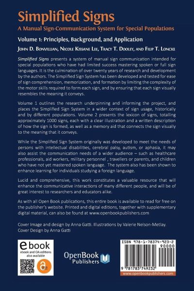Simplified Signs presents a system of manual sign communication intended for special populations who have had limited success mastering spoken or full sign languages. It is the culmination of over twenty years of research and development by the authors. The Simplified Sign System has been developed and tested for ease of sign comprehension, memorization, and formation by limiting the complexity of the motor skills required to form each sign, and by ensuring that each sign visually resembles the meaning it conveys. Volume 1 outlines the research underpinning and informing the project, and places the Simplified Sign System in a wider context of sign usage, historically and by different populations. Volume 2 presents the lexicon of signs, totalling approximately 1000 signs, each with a clear illustration and a written description of how the sign is formed, as well as a memory aid that connects the sign visually to the meaning that it conveys. While the Simplified Sign System originally was developed to meet the needs of persons with intellectual disabilities, cerebral palsy, autism, or aphasia, it may also assist the communication needs of a wider audience - such as healthcare professionals, aid workers, military personnel , travellers or parents, and children who have not yet mastered spoken language. The system also has been shown to enhance learning for individuals studying a foreign language. Lucid and comprehensive, this work constitutes a valuable resource that will enhance the communicative interactions of many different people, and will be of great interest to researchers and educators alike.