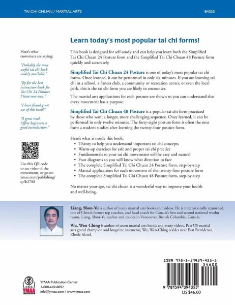 Simplified Tai Chi Chuan 24 Posture is one of today’s most popular and easy to learn tai chi forms. This book presents both the Simplified 24-posture Tai Chi form and the Simplified 48-posture Tai Chi form. Simplified Tai Chi Chuan 24 Posture is one of today’s most popular tai chi forms. Once learned, it can be performed in only six minutes. If you are learning tai chi in a school, a fitness club, a community or recreation center, or even the local park, this is the tai chi form you are likely to encounter. The martial arts applications for each posture are shown so you can understand that every movement has a purpose. The Simplified Tai Chi Chuan 48 Posture is a popular tai chi form practiced by those who want a longer, more challenging sequence. Once learned, it can be performed in only twelve minutes. The forty-eight posture form is often the next form a student studies after learning the twenty-four posture form. Here’s what is inside this book: * Theory to help you understand tai chi’s important tai chi concepts * Warm up exercises for safe and proper tai chi practice * Fundamentals so your tai chi movements will be easy and natural * Foot diagrams so you will know what direction to face * The complete Simplified Tai Chi Chuan 24 Posture form, step-by-step * Martial applications for each movement of the 24 posture form * The complete Simplified Tai Chi Chuan 48 Posture form, step-by-step This book presents in a modern easy-to-follow layout. Every tai chi movement is presented in 2-4 large photographs with clear instructions, followed by key points to help you learn properly. No matter your age, tai chi chuan is a wonderful way to improve your health and well-being.
